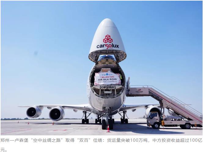 2014年1月,河南航投收購盧森堡貨航35%股權簽約儀式在鄭州舉行。同年6月,首條鄭州—盧森堡國際貨運航線開通,同年11月,盧森堡貨航鄭州航線貨運量就突破1萬噸;2015年11月,貨運量累計突破5萬噸,國際貨運量、國際貨運航線數、航班數量、國際通航點等主要指標躍居鄭州機場首位;2016年6月,累計貨運量突破10萬噸;2019年5月,50萬噸;2021年8月,80萬噸,2023年6月突破100萬噸。