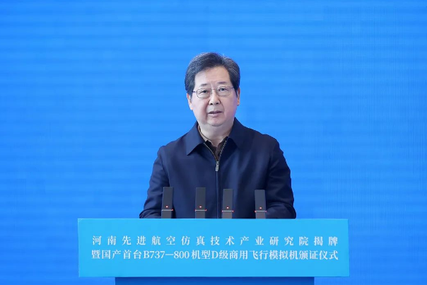 11月26日,河南先進(jìn)航空仿真技術(shù)產(chǎn)業(yè)研究院揭牌暨國(guó)產(chǎn)首臺(tái)B737-800機(jī)型D級(jí)商用飛行模擬機(jī)頒證儀式在航空港區(qū)舉行。省委書記樓陽(yáng)生出席并講話。