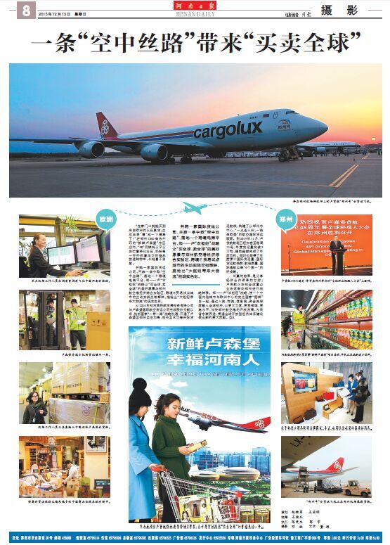 在8次報道中,既有會前的“熱身”宣傳,又有會中的集中點擊,還有會后的回顧追蹤,形成系列,精彩紛呈。13日,《河南日報》以圖文并茂的整版篇幅,對河南航投與盧貨航的合作,尤其是“新鮮盧森堡”雙向跨境E貿(mào)易進行了詳細報道。整個報道以新聞攝影為主,既有盧貨航“鄭州號”波音747-8F全貨機,也有鄭-盧航線的專業(yè)操作流程展示,還有河南百姓采購“新鮮盧森堡”商品的真實場景……以鄭盧“雙樞紐”為典型案例,圍繞“一條‘空中絲路’帶來‘買賣全球’”這一主題,生動展現(xiàn)了河南省依靠藍天對外開放的新思路和新成就。