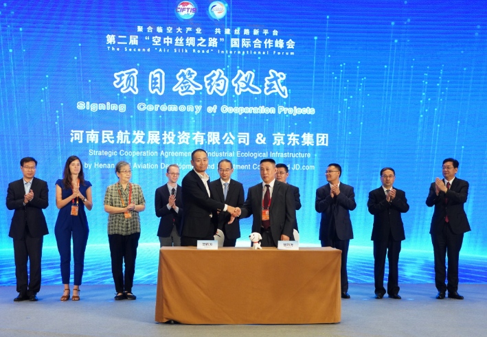 在隨后的成果發(fā)布環(huán)節(jié),河南航投總經(jīng)理、黨委副書(shū)記、副董事長(zhǎng)劉建葆代表公司分別與中航通用飛機(jī)有限公司(以下簡(jiǎn)稱(chēng)航空工業(yè)通飛)、法國(guó)Simaero控股公司、中國(guó)檢驗(yàn)認(rèn)證(集團(tuán))公司(以下簡(jiǎn)稱(chēng)中檢集團(tuán))、京東集團(tuán)簽署戰(zhàn)略合作協(xié)議。黃強(qiáng)及中外嘉賓代表見(jiàn)簽。趙磊主持發(fā)布圖書(shū)《“一帶一路”高質(zhì)量發(fā)展——河南“空中絲綢之路”的生動(dòng)實(shí)踐》。該書(shū)以紀(jì)實(shí)筆觸全方位記錄了河南主動(dòng)融入“一帶一路”建設(shè),向天尋路,架起一條互利各國(guó)交通運(yùn)輸、聚合經(jīng)貿(mào)文化發(fā)展的“空中絲綢之路”,真實(shí)展現(xiàn)出河南打造內(nèi)陸開(kāi)放新高地、實(shí)現(xiàn)中原更出彩的新局面。
