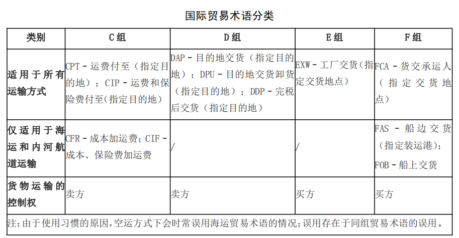 在國(guó)際貿(mào)易的貨物銷售合同中,進(jìn)出口商使用國(guó)際商會(huì)《國(guó)際貿(mào)易術(shù)語(yǔ)解釋通則》(Incoterms),界定買賣雙方在風(fēng)險(xiǎn)、成本、運(yùn)輸和保險(xiǎn)方面的義務(wù),避免誤解、爭(zhēng)議與因此導(dǎo)致的損失以及其他法律難題。根據(jù)最新的《國(guó)際貿(mào)易術(shù)語(yǔ)解釋通則》2020版,國(guó)際貿(mào)易術(shù)語(yǔ)共分成2類4組11個(gè)。